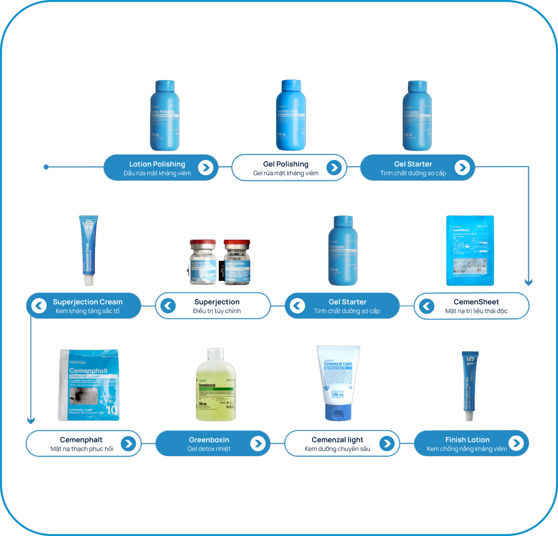 ![]() | CON06 | CemenSheet – Mặt nạ trị liệu thải độc | Ban đêm (1 lần/tuần) | Đắp các phần mặt nạ lên theo hướng dẫn. Đắp khít và ôm sát toàn mặt, sau 10–20 phút lột ra và rửa sạch với nước ấm. |