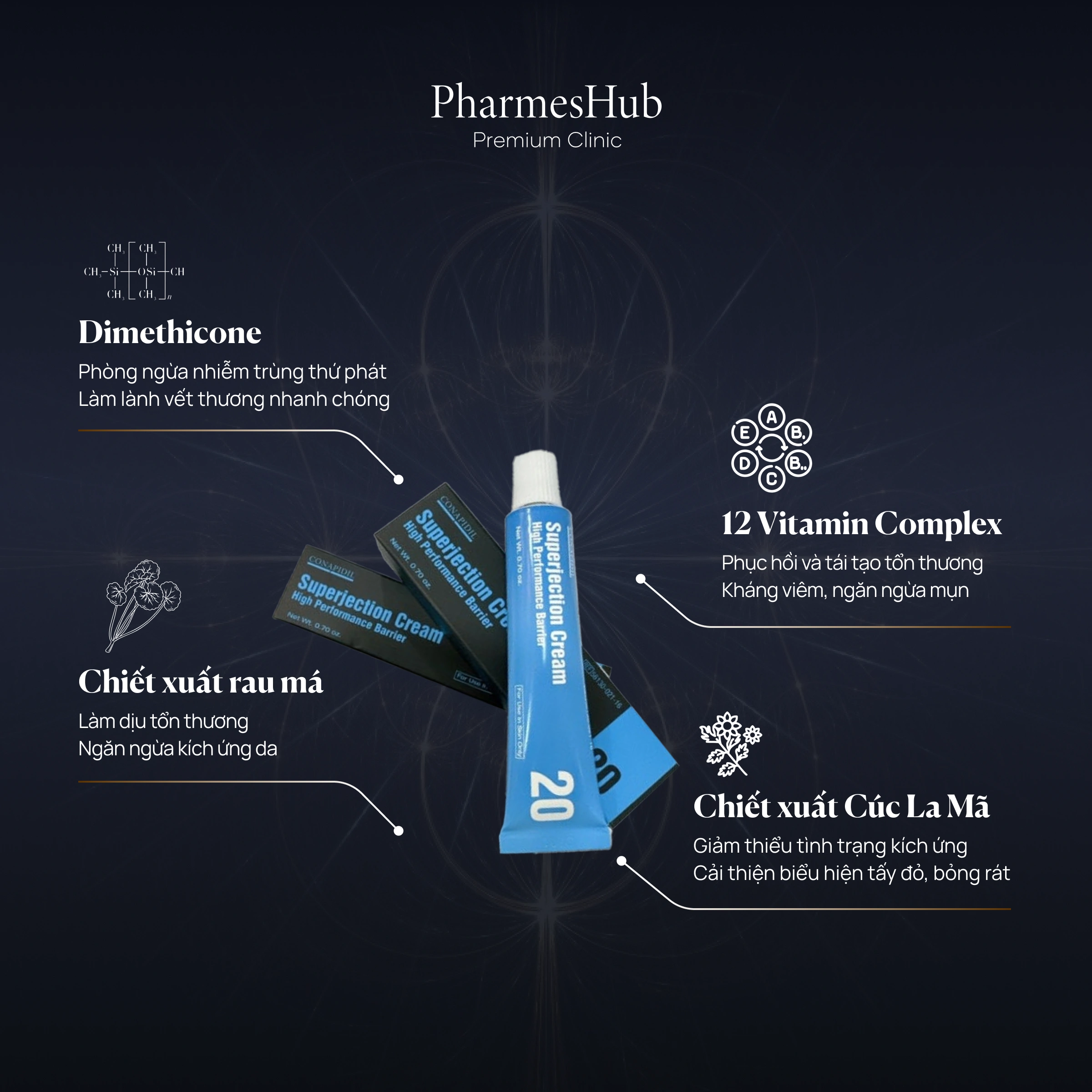 Kem kháng tăng sắc tố Superjection Cream 20 hỗ trợ chăm sóc da nhạy cảm sau trị liệu, bổ sung độ ẩm phù hợp và tăng cường tái tạo nhanh chóng